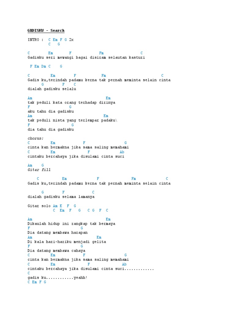 Intro C Em F G x2 C G Verse C Em F Fm C Gadisku seri mewangi bagai disiram selautan kasturi F Em Dm C G C Em F Fm C Gadis ku termanis senyum mu biar ku telan selautan hempedu G F C dialah gadisku selalu Am Em tak peduli kata orang terhadap dirinya F G aku.